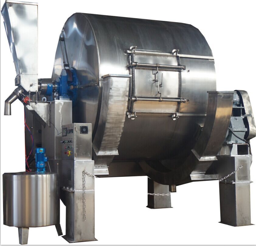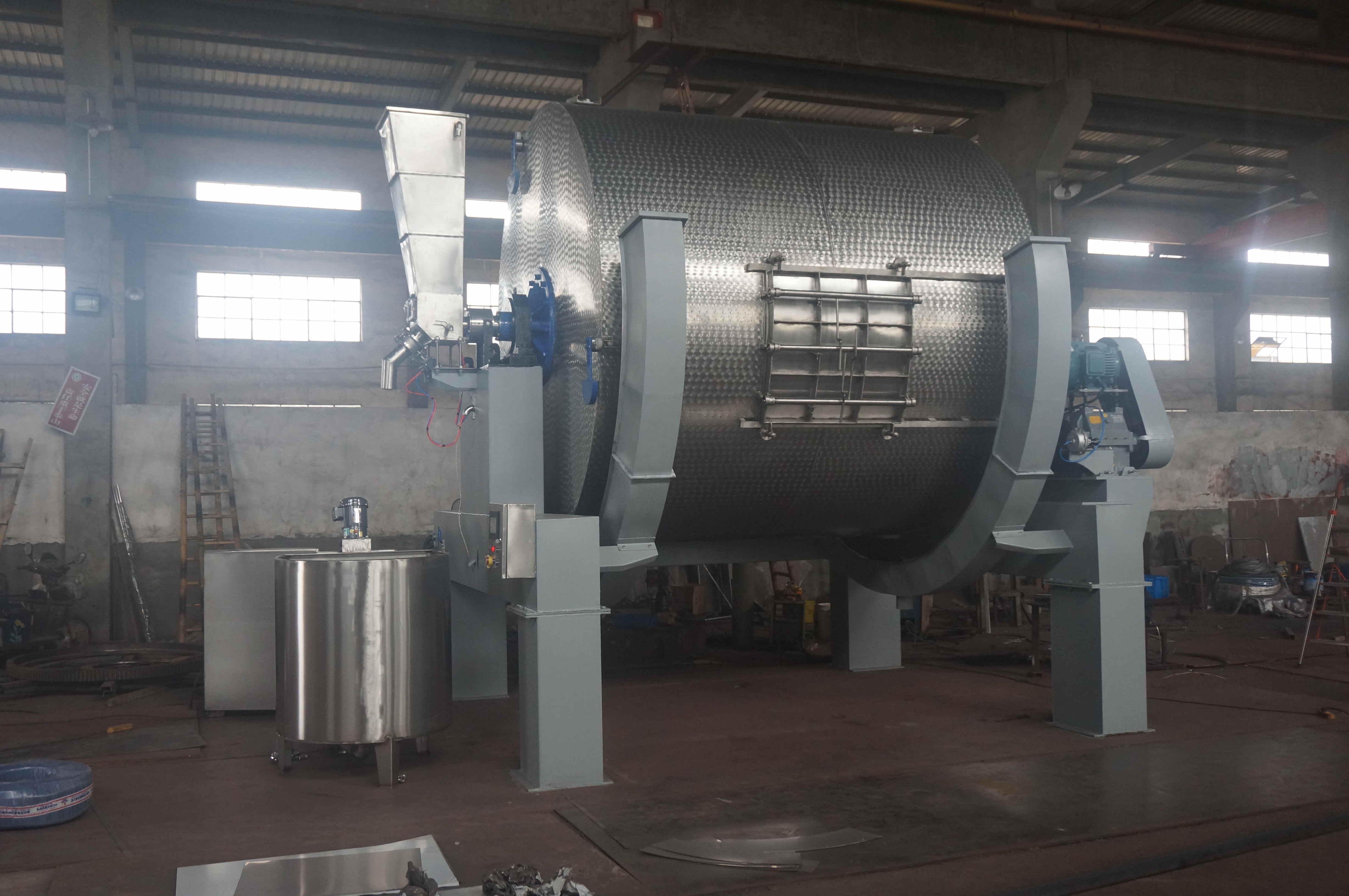 我厂全新研制的GH型不锈钢超载转鼓 用该转鼓可以减少浸水、鞣制、染色工序用水量,可以减少化工原料用量,减少了废液总量排放。鼓内采用新式结构,在同样工艺时间内使皮张更柔软、染色更均匀。转鼓出皮时无阻碍,比普通转鼓多装载30%以上,装载总量可以达到转鼓容积的60%—70%。 1、GH不锈钢超载转鼓主体部分由鼓体、机座、传动系统、带有加热循环系统的交换器组件、防护系统和电气控制系统等部分组成,辅助部分主要配置化工原料搅拌桶,还有辅助控制电器箱等 2、鼓体采用不锈钢板材制作,鼓体内外层之间用优质保温材料填充,使得转鼓有良好的保温效果。 3、转鼓一侧配置自动排气阀,使鼓体在运转过程中保证鼓内外气体流通。 4、转鼓另一端装有交换器系统,鼓内有双方向旋转自动液体循环系统,当转鼓转动时,鼓内液体由鼓内循环系统流入交换器中,在交换器中进行加温,在循环回鼓内。 交换器上配有观察窗,进行观察。 5、鼓体内装有带倾斜度的长档板,这种挡板机械作用大,特别适合牛皮加工。 6为缩短转鼓清洗时间,在鼓体一侧增加了两组手动排水装置。 7传动系统:电动机传动转鼓专用减速箱变速后,再通过齿轮带动鼓体转动。减速箱配置了气动刹车装置。整个传动系统安全可靠、经久耐用。 8电气控制系统:变频调速、PLC电路控制、气动控制或人工控制排水阀门。本机运行总时间、运行方式,加温控制在仪表上均可设置。 主要参数